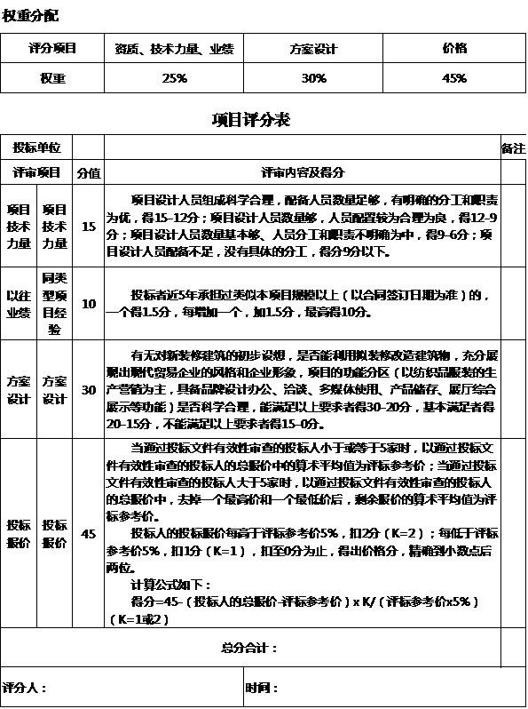 十三、本招標項目以評分權(quán)重分配原則進行評標,評分項目含有資質(zhì)、技術(shù)力量、業(yè)績,占比25%;方案設(shè)計,占比30%;投標價格,占比45%。以綜合得分高者中標。項目評分表詳見附件。